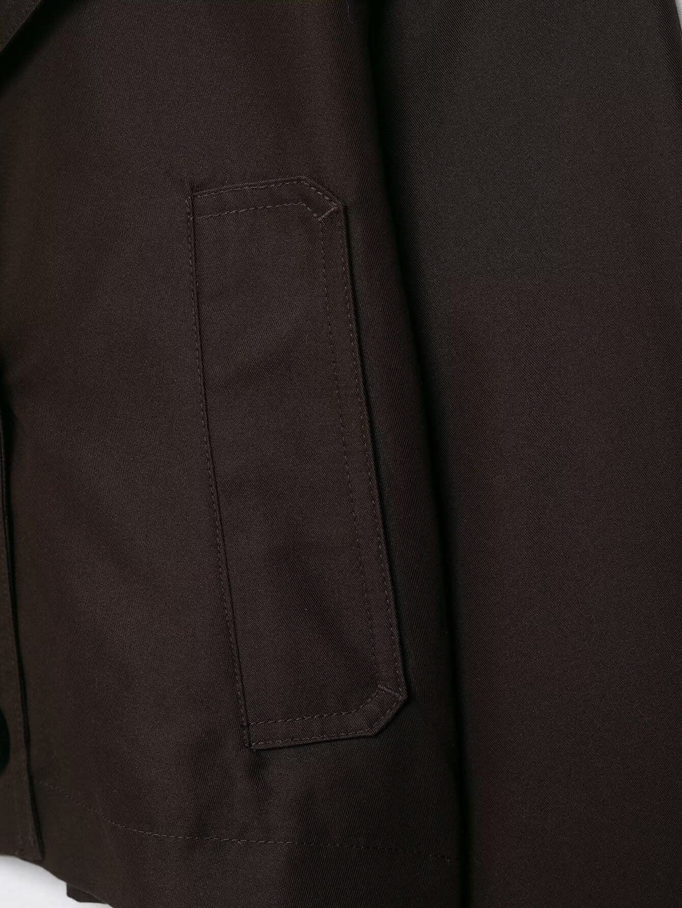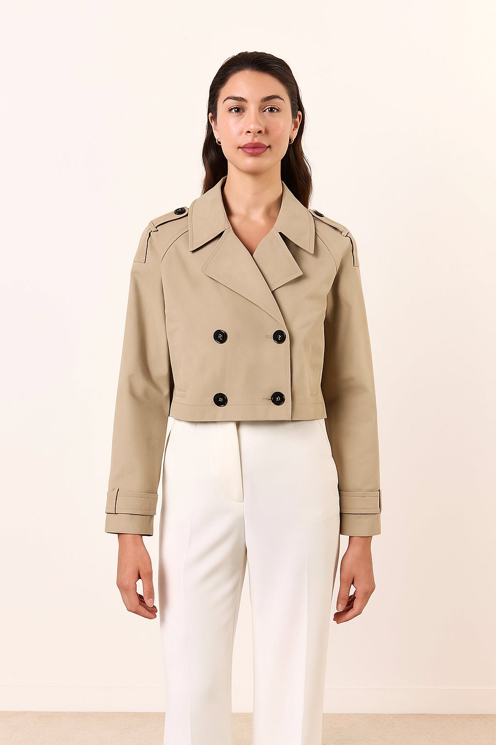 Deze korte trenchcoat combineert de klassieke charme van een trench met een eigentijdse, verfijnde snit. De stevige stof en hoogwaardige afwerking zorgen voor een luxueuze uitstraling die moeiteloos te combineren is met zowel een nette pantalon als een casual jeans. Dankzij de cropped lengte krijgt de jas een moderne look, terwijl de dubbele rij knopen en de schouderdetails trouw blijven aan het iconische trenchdesign.